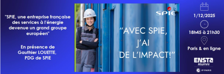 "ENSTA Alumni organise une conférence grand témoin avec Gauthier Louette, PDG de SPIE, sur le thème "SPIE, une entreprise française des services à l'énergie devenue un grand groupe européen". Elle aura lieu lundi 1er décembre, à partir de 18h45, en présentiel à l'Espace Saint-Martin à Paris, et en visioconférence. Un cocktail suivra.